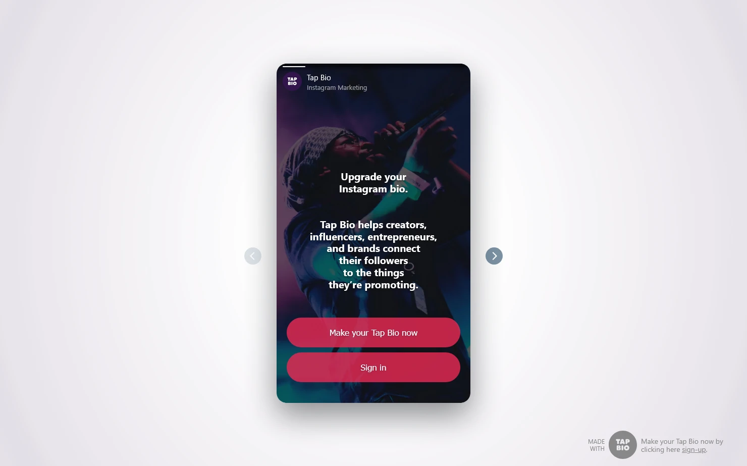 Tap.bio takes a more creative approach: instead of just a list of buttons, it uses “cards” that users can swipe through (like story-cards) which can host images, videos and links. This gives the landing page a more engaging feel.
